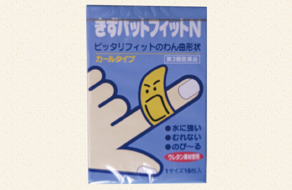 きずパットフィットNは、形状が直線ではなくカールしているので指などにピッタリフィットするキズ絆創膏です。「水に強い」「むれない」「伸びる」の特徴があります。